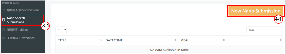 3-1) Nanosymposium speakers click the “Nano Speech Submission” on the left list and 4-1) click "New Nano Submission" organge button to fill in the form and submit the abstract. Please click "Abstract Submission" and read the guidelines before submitting.