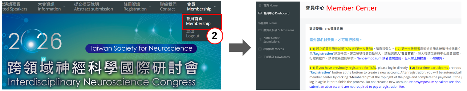 1-1) if you have previously registered for TSfN, please log in directly. 1-2) First-time participants are required to register by clicking the "Registration" button at the bottom to create a new account. After registration, you will be automatically logged in. 2) Please proceed to the member center by clicking "Membership" at the top right of the page and complete the payment. If the payment is not paid successfully, please log in again later to finish the process. Do not create a new account. Nanosymposium speakers are also required to register, but they only need to submit an abstract and are not required to pay a registration fee.